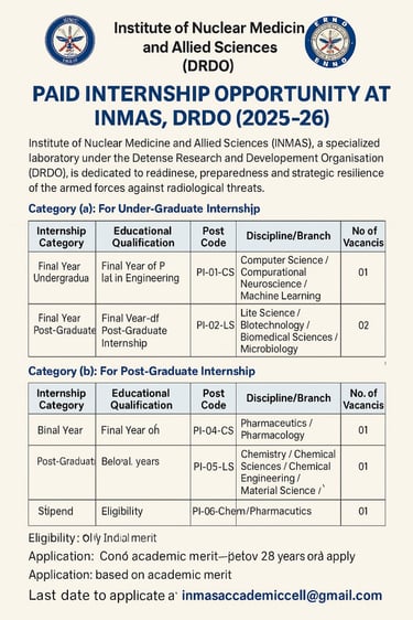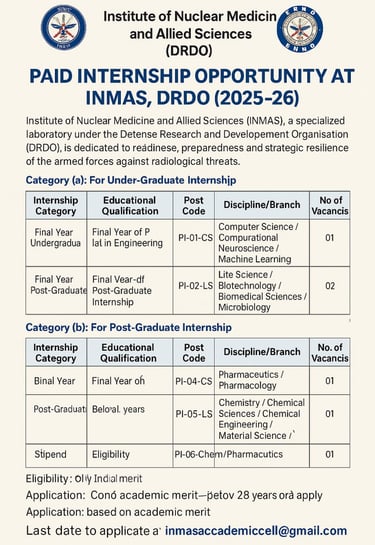 DRDO-INMAS Paid Internship 2025: A Rare Opportunity for Science & Engineering Students!