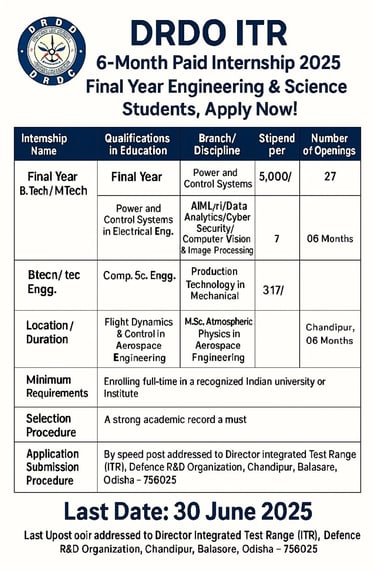 DRDO ITR 6-Month Paid Internship 2025 – Final Year Engineering & Science Students, Apply Now!