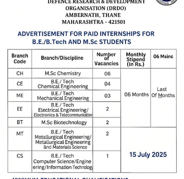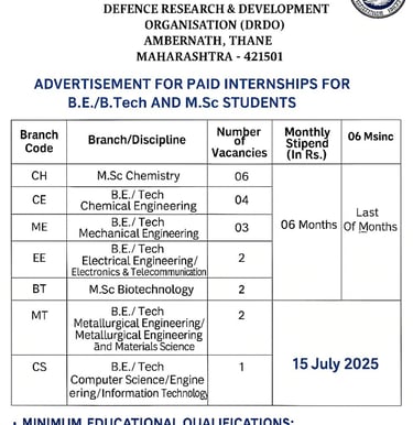 Are you looking for a last year b.e./b.tech or M.Sc Student Science or Engineering to gain experience from the real world in strategic defense research? Defense Research and Development Organization (DRDO), under the Ministry of Defense, has a chance to collaborate with India's top defense researchers in the Navy Material Research Laboratory (NMRL).