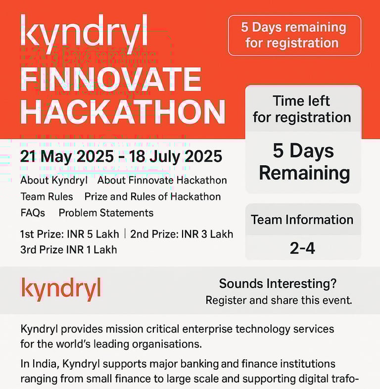 Overview: Kyndryl's Finnovate Hackathon 2025 offers a grand platform to bring innovation to the fintech domain. Solve real-world problems with your team and win cash prizes up to INR 5 Lakhs.