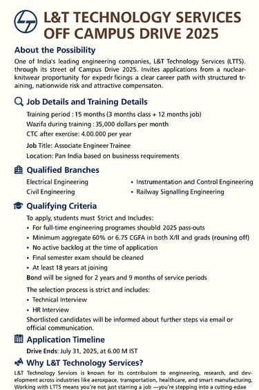 One of India's leading engineering companies, L&T Technology Services (LTTS), through its street of Campus Drive 2025, invites applications from a Batch in 2025 for the role of Associate Engineer Trainee. This is a very time opportunity for nuclear knitwear and provides a clear career path with structured training, nationwide risk and attractive compensation.