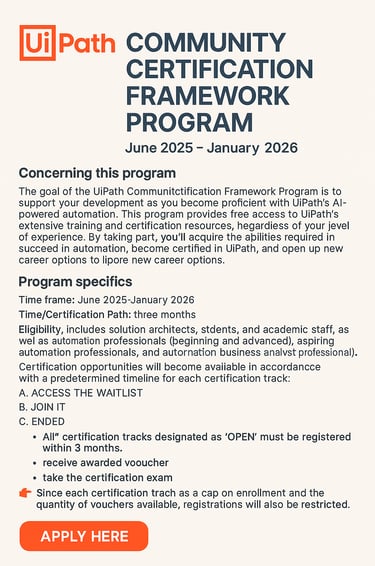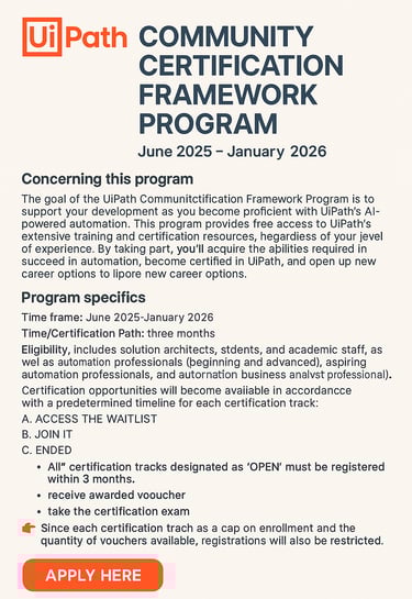 The goal of the UiPath Community Certification Framework Program is to support your development as you become proficient with UiPath's AI-powered automation. This program provides free access to UiPath's extensive training and certification resources, regardless of your level of experience. By taking part, you'll acquire the abilities required to succeed in automation, become certified in UiPath, and open up new career options. Boost your professional profile, obtain worthwhile certifications, and connect with a global network of learners. Take the next step in your AI-powered automation journey by starting today!