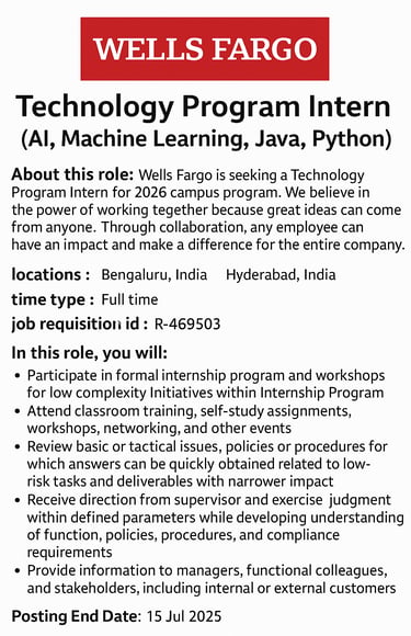 Wells Fargo Technology Program Intern (AI, Machine Learning, Java, Python)
