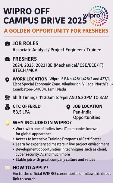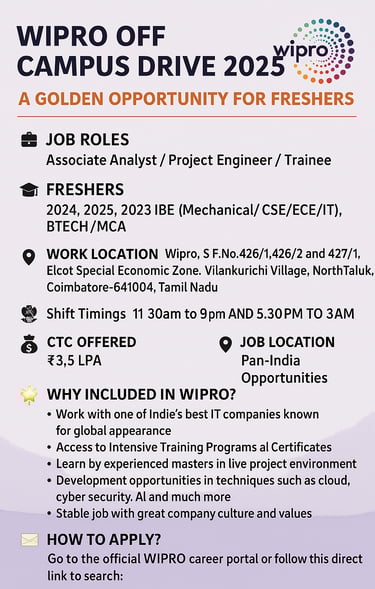 Are you a new confirmation ready to take your first step in the technology industry? One of the largest IT service companies in India, Wipro has officially launched the Off Campus Drive 2025 to appoint talented people to multiple roles, including Associate Analyst, Project Engineer and Trainee Posts.
